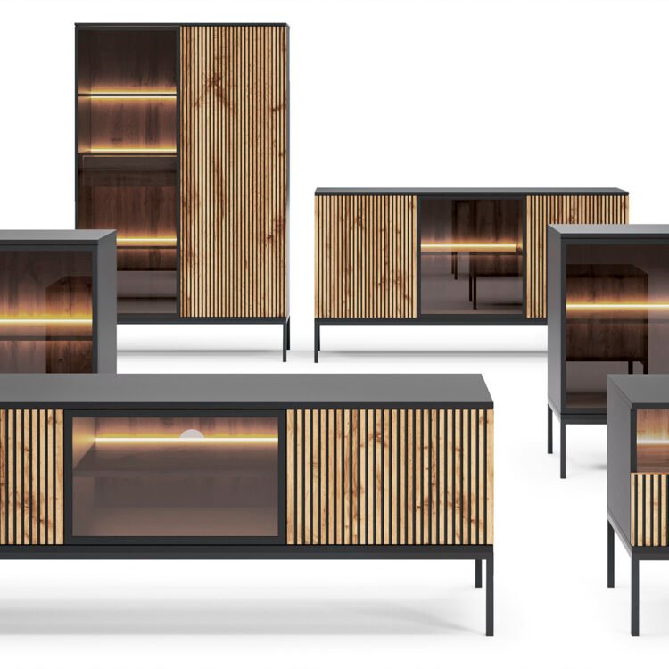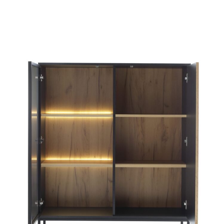 COMO Witryna 2PKT LED zachwyca eleganckim frezowanym frontem w kolorze dąb wotan, który dodaje naturalnego uroku, a także elegancji do Twojego wnętrza. Kontrastujący czarny korpus mebla wzmacnia nowoczesny i wyrazisty charakter witryny. To stylowy mebel z przeszklonymi drzwiami, idealny do wyeksponowania ozdobnych przedmiotów, zastawy stołowej czy książek. Dzięki eleganckiemu designowi, a także funkcjonalności, witryna dodaje wnętrzu charakteru, jednocześnie chroniąc cenne przedmioty przed kurzem.