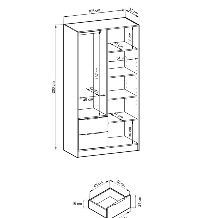 - Szafa posiada 2 uchylne drzwi, wyposażone w solidne metalowe uchwyty, oraz 2 szuflady, które zapewniają dodatkową przestrzeń do przechowywania