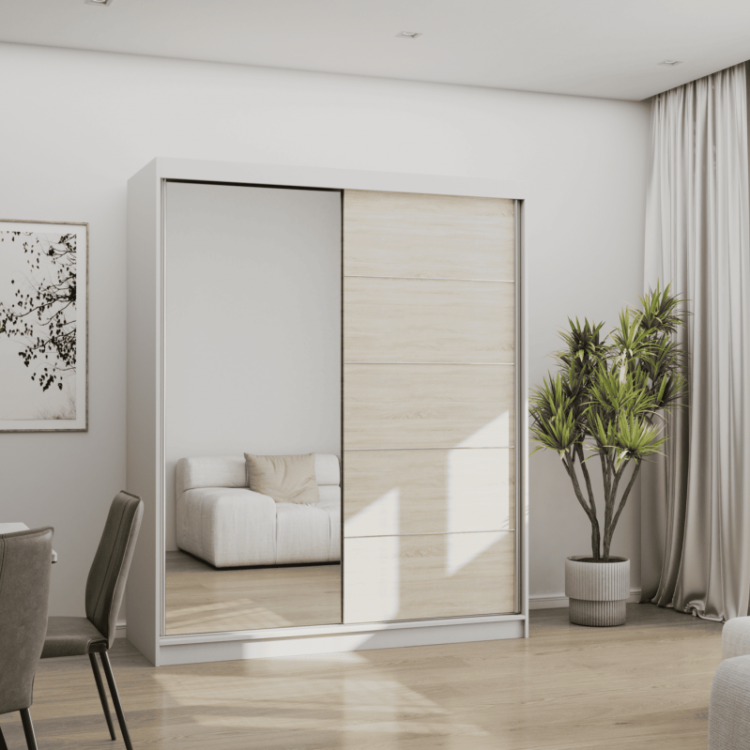 Ta szafa jest idealna do przechowywania odzieży wierzchniej, ubrań, pościeli i koców. Pojemne półki i drążek na ubrania ułatwiają segregację ubrań, a górne półki są idealne na walizki. Duże lustro na jednych z drzwi i aluminiowe uchwyty biegnące wzdłuż drzwi przesuwnych nadają szafie nowoczesny i stylowy wygląd. Szafa optycznie powiększa pomieszczenie.